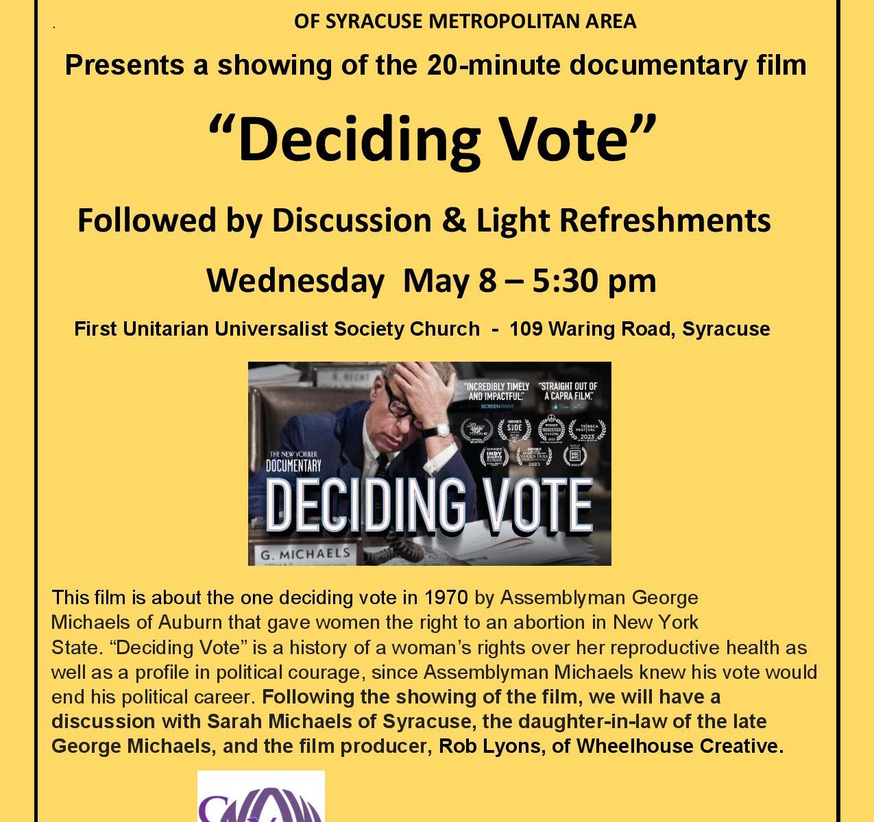 Posted on April 19, 2024April 19, 2024 by cnynowJoin us for the showing of the documentary Film “Deciding Vote” RSVP TO lwvsyr@gmail.com by May 2, 2024 Share this: Click to share on X (Opens in new window) X Click to share on Facebook (Opens in new window) Facebook Click to email a link to a friend (Opens in new window) Email Click to print (Opens in new window) Print Related