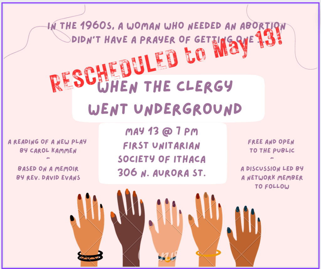 When the Clergy Went Underground presentation POSTPONED to May 13. It will be at the same time and place and 7PM, First Unitarian Society of Ithaca, 306 N. Aurora St.