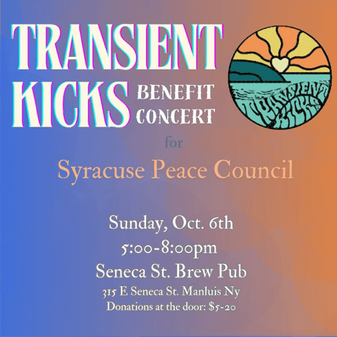 Join CNYNOW members at the Syracuse Peace Council’s October 6th Transient Kicks concert at Seneca St Brew Pub! #CNYNOW #CommunitySupport #SpreadLove #PeacefulWorld #TogetherForPeace #PeaceAndLove #Harmony
