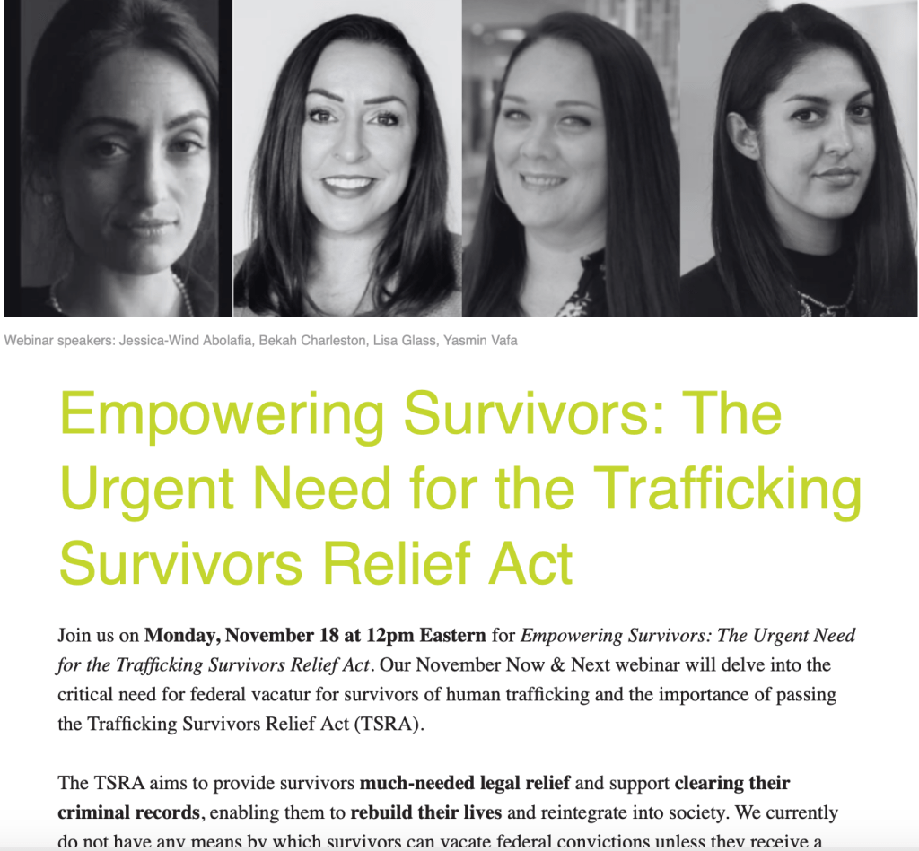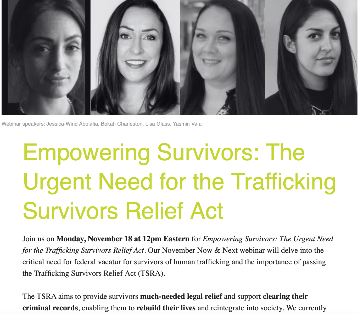 Join A World Without Exploitation on Monday 11/18 at 12PM for a webinar about the need for legislative support for survivors of human trafficking and the importance of passing the Trafficking SurvivorsĀ Relief Act. Learn more and register at https://us02web.zoom.us/webinar/register/WN_ZkcjQx59Tpu63T4bYzJfyw?_gl=1*gi1ujj*_gcl_au*MTAzMzc3MjUyNy4xNzMwNzU2OTY3*_ga*NTQyNTAyNjAxLjE3MjI5NTUzMDk.*_ga_L8TBF28DDX*MTczMTM0NDE0OS42OS4xLjE3MzEzNDQ4NzAuMC4wLjA.&_ga=2.134016006.984183470.1731297955-542502601.1722955309#/registration